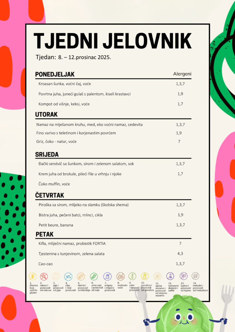 Jelovnik NAPOMENA: Škola ima pravo izmjene jelovnika u slučaju poteškoća s dostavom namirnica. Kod ručka koristimo eko proizvode putem zelene nabave i to krumpir i mrkva kao i eko jabuke. Dio eko proizvoda, domaći med, batati, prirodni voćni namazi, kelj, žitarice koje koristimo u prehrani učenika. Jelovnik sastavio: Daria Grgić, kuharica Kontrolirala: Lana Zelenika, tajnica Odobrila: Katarina Rajković, ravnateljica