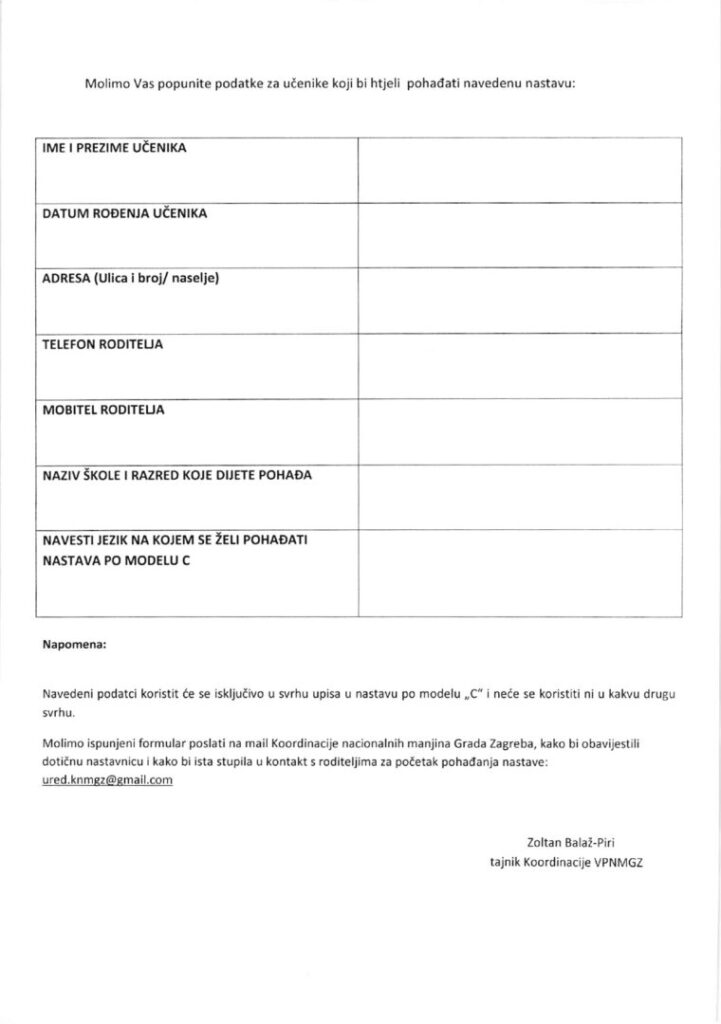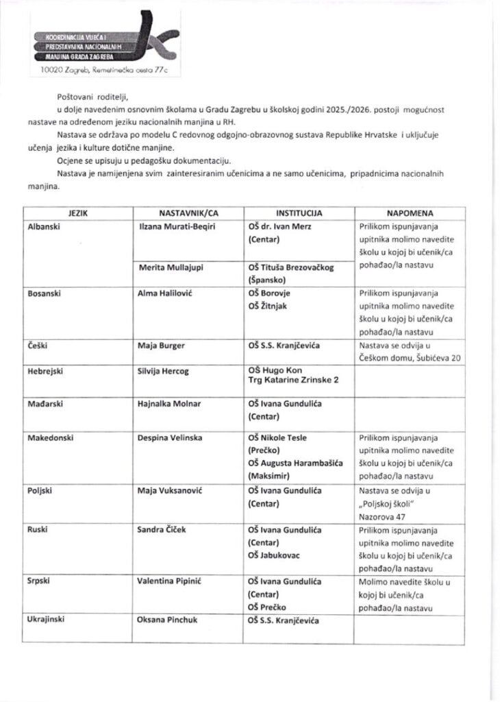 U cilju poticanja obrazovanja djece na jeziku i pismu nacionalnih manjina po modelu C, upoznajemo vas s mogućnostima koje imate u zagrebačkim osnovnim školama.